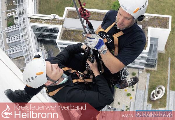 \"Früher musste man sich manuell nach oben arbeiten, das ist mit der Motorwinde doch deutlich schneller und angenehmer\", kommentiert Jürgen Vogt, der Leiter der Höhenrettungsgruppe. Zum ersten Mal übt die Heilbronner Berufsfeuerwehr am TDS-Turm in Neckarsulm, immerhin das höchste Bürogebäude in der Region.