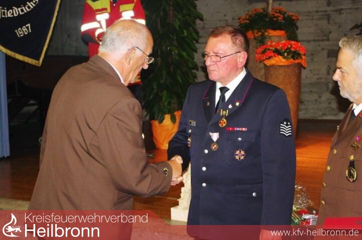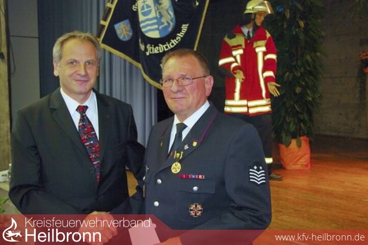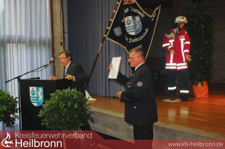 Als einsatzfreudigen Mensch mit Magnetwirkung bezeichnete ihn Bürgermeister Peter Dolderer. Er sprach von einem denkwürdigen Tag. 30 Jahre lang hatte Kurt Semen die Geschicke der Bad Friedrichshaller Feuerwehr vorbildlich geleitet. Er war ein geschätzter und beliebter Fachmann, der stehts das notwendige Vertrauensverhältnis zu Verwaltung und Gemeinderat hatte, so Dolderer. Seine Vorschläge rund um das Feuerlöschwesen waren immer fundiert, die Modernisierung wurde mit Augenmaß durchgeführt, so dass die Wehr stehts auf dem aktuellen Stand war. Ein ganz großes Vorbild war Semen beim Hochwassermanagement. Seine Entwürfe haben Vorbildcharakter im ganzen Land. Neben der Einsatzabteilung war ihm die Jugendfeuerwehr ein großes Anliegen. Er hatte frühzeitig erkanntt, dass die Nachwuchssicherung nur über eine funktionierende Jugendwehr sichergestellt werden kann. Für seine Verdienste war er schon in der aktiven Dienstzeit mit zahlreichen Ehrungen, bis hin zum Deutschen Feuerwehr Ehrenkreuz in Gold, ausgezeichent worden. Auf Beschluss des Feuerwehrausschusses wurde er vom Gemeinderat zum Ehrenkommandant ernannt.