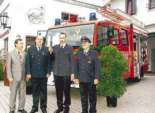 Bild: Über das Löschgruppenfahrzeug freuen sich von links Peter Dolderer, Uwe Vogel, Michael Reiß und Kurt Semen. (Foto: Edgar Herterich)