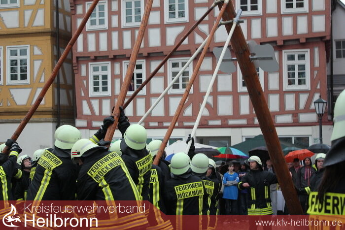 Viele Fragen gab es zum Maibaum, hierzu die Antworten: Ein Fichten-Exemplar aus unserem Wald, mit künstlicher Tannenspitze und Tannenkranz mit Flatterbändern in Möckmühler Wappenfarbe geschmückt, 420 kg schwer, 18 Meter lang und er wird auch 2014 wieder über das Stadtfest und den Martini-Markt stehen und den Oberen Marktplatz schmücken.
