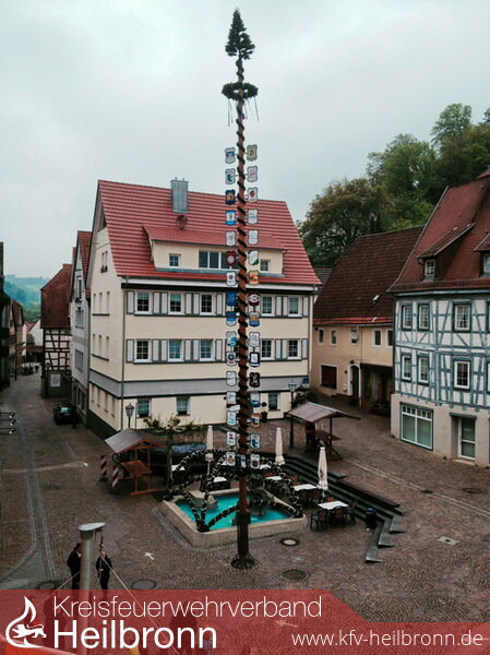 Am frühen 1. Maimorgen grüßte somit ein komplett fertiger Vereins- und Maibaum die Wanderer auf dem Oberen Marktplatz. Die Feuerwehr bedankt sich recht herzlich bei den über 400 Umzugsteilnehmern, darunter erstmalig eine Delegation aus unserer ungarischen Partnerstadt Piliscsaba sowie die Rathausdamen in Dirndltracht. Unser Dank gilt aber auch den zahlreichen Zuschauern, welche wir bei diesem Wetter nicht in der Anzahl erhofft hatten. Dankeschön an unsere Landfrauen, dem ASV sowie an die beteiligten Gastronomiebetriebe aus der Innenstadt, welche sich ebenfalls nicht entmutigen ließen und die Bewirtung der Gäste und Teilnehmer wieder vorbildlich übernahmen.