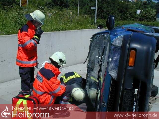 Total demoliert liegt das Fahrzeug auf der Seite. Das Unfallopfer ist eingeklemmt auf dem Beifahrersitz, mit starken Schmerzen im Rückenbereich. Immerhin ist der junge Mann ansprechbar. "Der Erstzugang muss über die Heckscheibe erfolgen", sind sich Notarzt und Feuerwehr-Gruppenführer einig. Gemeinsam haben sie sich ein Bild von der Unfallsituation gemacht. Das Miteinander wird groß geschrieben: Freiwillige Feuerwehr Lauffen und Arbeiter-Samariter-Bund (ASB) Heilbronn üben die patientengerechte Rettung.