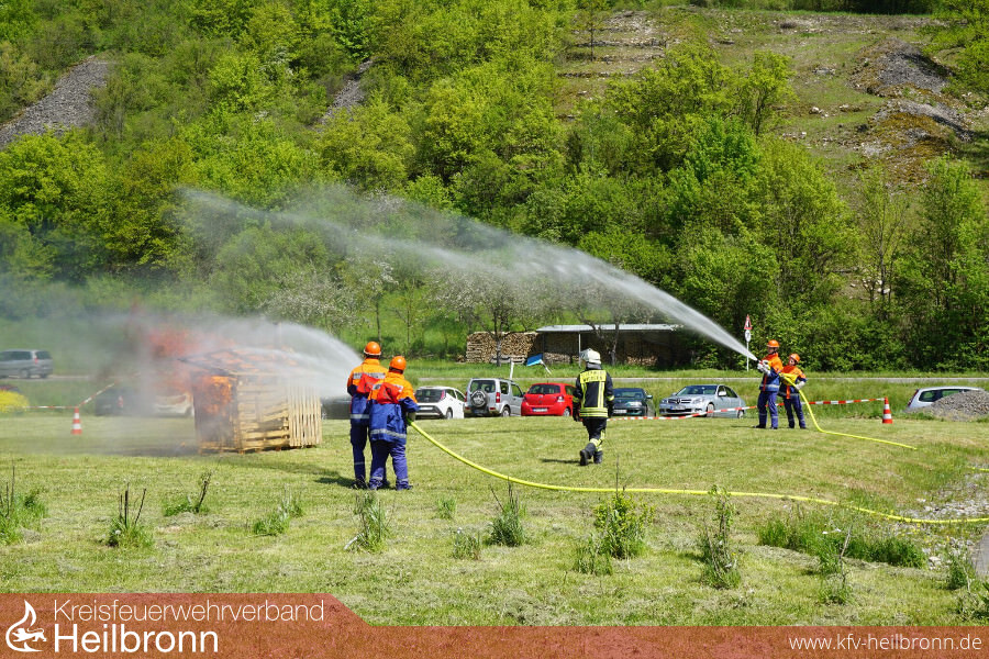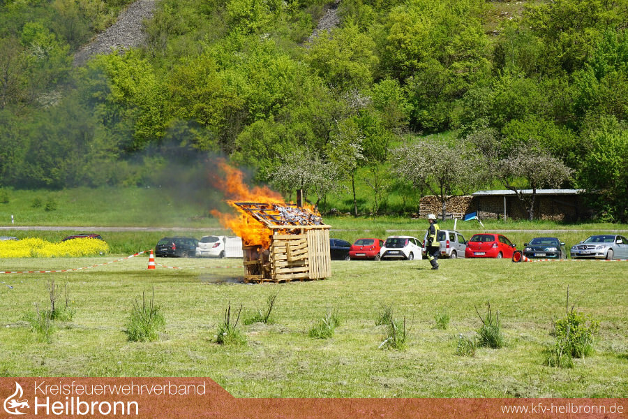 Nach dem Mittagessen führte die Jugendfeuerwehr eine Schauübung vor. Ein aus Paletten gebautes Brandhaus wurde entzündet und die Jungen und Mädchen zeigten, wie ein Einsatz zum Löschen eines Brandes korrekt abläuft. Vom Verteilen der Aufgaben an die einzelnen Einsatzkräfte über Auswerfen und anschließen der Schläuche bis zum erfolgreichen Löschen des Brandes zeigten die Nachwuchsfeuerwehrmänner und Frauen ihr Können.