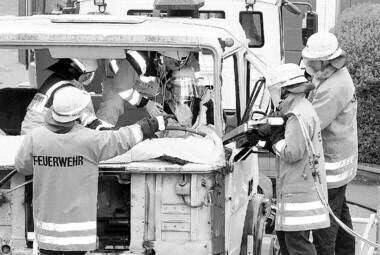 „Leute, dem Patienten geht es schlechter.“ Wolfgang Balz treibt seine Kollegen an. Schon über 30 Minuten schaffen Matthias Fried und seine Männer an der Kabine, hebeln die Türe aus den Scharnieren, schneiden das Blech auf. Dann gibt der Notarzt die Anweisung: „Auf Kommando ganz langsam raus.“ Die Männer heben Dieters Beine an, schieben ihm die Bahre unter. Dieter schreit vor Schmerzen. Nach genau 45 Minuten ist er gerettet, die Feuerwehrmänner sind erledigt. Matthias Fried: „Die Übung war kräfteraubend, und der Patient hat sehr gut gespielt.“