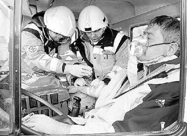Foto:Opfer Dieter Kleinschrod (oben) wird von Notarzt und Rettungsassistent versorgt. Die Feuerwehr bemüht sich unterdessen, den Weg ins Lkw-Führerhaus freizubekommen. (Fotos: Veigel)