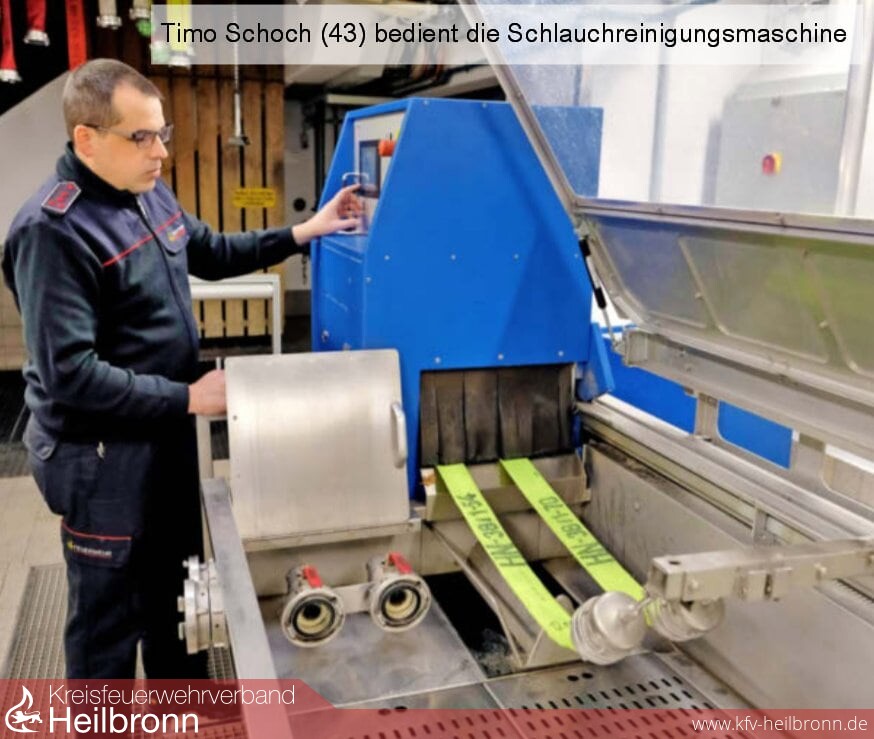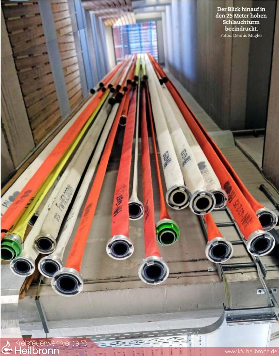Hat es irgendwo gebrannt, ist nicht nur die Einsatzkleidung verschmutzt und muss gewaschen werden. „Am dreckigsten sind die Schläuche. Die werden durch den Brandschutt gezogen“, sagt Vogt. 15 bis 20 Meter ist ein Standard-Schlauch lang. Der längste misst 60 Meter. Nach einem Brand rollen die Männer die Schläuche zusammen und packen sie auf den Schlauchwagen. Zurück im Magazin steht Hauptbrandmeister Timo Schoch bereit. Der 43-Jährige aus Untergruppenbach ist Leiter der zentralen Schlauchwerkstatt. Die schmutzigen Schläuche werden in eine Maschine eingespannt, gereinigt und auf Dichtigkeit geprüft. Und wer sich schon einmal gefragt hat, welche Funktion der 25 Meter hohe Turm auf dem Gelände der Feuerwehr erfüllt? Er dient als Trainingsobjekt für Abseil- und Leiterübungen. Oben drauf sind die Funkantennen montiert. Und im Innern werden die nassen Schläuche zum Trocknen aufgehängt. Nicht nur die von der Feuerwehr Heilbronn. „Alle Feuerwehren südlich der Stadt bringen ihre gebrauchten Schläuche zu uns“, sagt Schoch. Die nördlichen Landkreisgemeinden bringen sie zur Feuerwehr nach Neckarsulm. „Die Schläuche werden von uns geprüft und bei Bedarf repariert. Alles wird dokumentiert.“ Sind die Schläuche sauber, erfolgt Lieferung frei Haus. Schläuche der Heilbronner Feuerwehr kommen ins Schlauchlager. Bereit für den nächsten Einsatz.