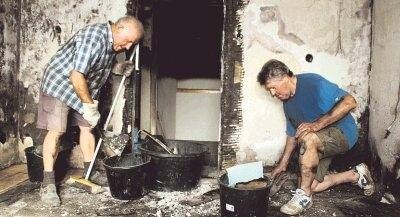Leer geräumt Helfer in der Not sind zur Stelle: Bad, Küche, Wohn- und Schlafraum sind leergeräumt und im Container entsorgt. Mit rußigem Gesicht und schwarz gefärbten Knien kehren Anton und Michael Ikker Brandschutt zusammen. Auch das Wohnzimmer hat Schaden genommen, durch Löschwasser sind Holzdecke, Teppichboden und Wohnzimmerschrank beschädigt.