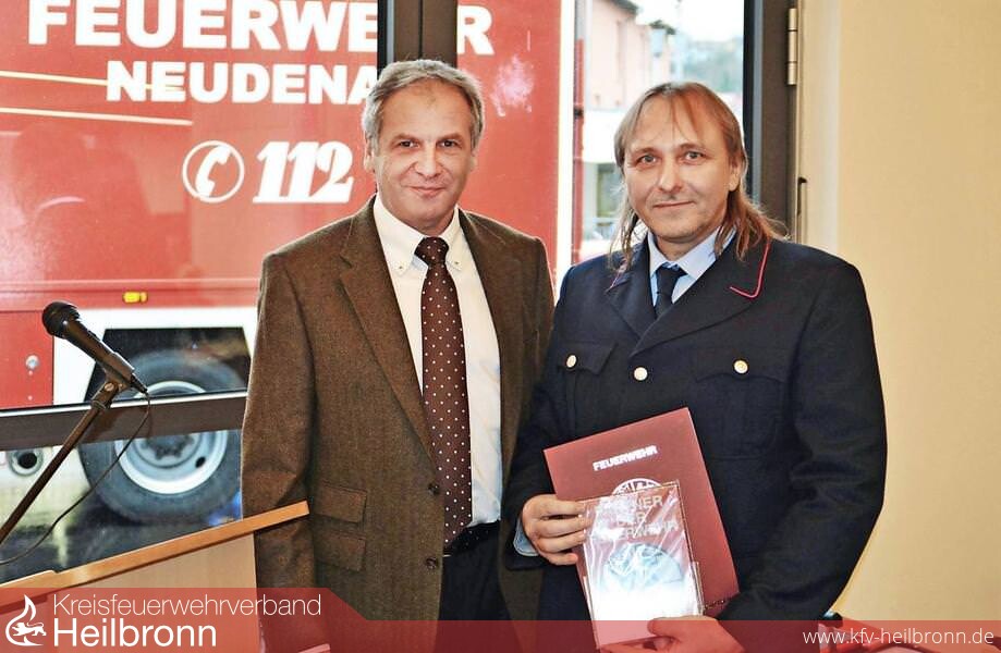 Auszeichnung Für die Führung der Neudenauer Freiwilligen Feuerwehr war klar, ihren Kameraden und selbständigen Meister für die Verleihung der Plakette „Partner der Feuerwehr“ vorzuschlagen. Die Feuerwehr feierte heuer ihr stolzes 150-jähriges Bestehen mit gleich mehreren Veranstaltungen. Ihr Jubiläumsjahr schloss sie am vergangenen Sonntag mit einem St.-Florians-Gottesdienst in der St. Laurentiuskirche ab. Aus diesem Grund weilte der Innenminister von Baden-Württemberg, Reinhold Gall, mehrfach in der Jagsttalstadt und auch am vergangenen Sonntag. Gall nahm die Gelegenheit wahr, auch als Vorsitzender des Kreisfeuerwehrverbandes, Wolfgang Steer mit der Plakette auszuzeichnen. „Ich spreche ihnen meine besondere Wertschätzung für ihre Leistungen für die Allgemeinheit aus, sie gewährleisten die Rufbereitschaft in besonderem Maß“, sagte Reinhold Gall und überreichte ihm die Plakette samt Urkunde.