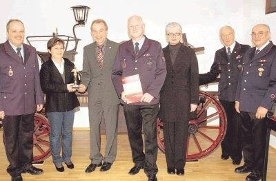 Bild: Waren mit dem Verlauf des Jubiläums zufrieden (von links): Kommandant Harald Zeyer, Karin Kieser, Bürgermeister Rolf Kieser, Hans Müller, Isolde Döbele-Carlesso, Ehrenkommandant Kurt Sommer und Ehrenmitglied Gerhard Kohler. (Foto: Gerhard Dubinyi)