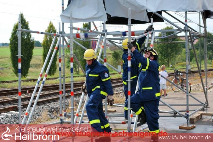 Ausrüstung Ins Auge stechen sofort Fahrzeuge auf dem Gelände neben dem Bahnhof. Die sind nicht feuerrot, sondern nachtblau. Sie gehören dem Technischen Hilfswerk Heilbronn, das sich vorstellt. Das Fahrzeug mit den vielen Schubladen ist der ersten Bergungsgruppe zugeordnet. \"Das ist unser Allroundfahrzeug GKW 1, damit können wir als erstes ausrücken und helfen\", erklärt Gruppenführer Andreas Nagel. Sollte die Ausrüstung nicht reichen, werden die Fachgruppen dazu geholt. Atemschutz, Beleuchtungen, Notstromaggregat und vieles andere genügen zunächst, um Menschen zu retten. Allein die Hebekissen, die jetzt friedlich unter den Reifen des 16-Tonnen-Gefährts liegen, schaffen bis zu 40 Tonnen. Ein dreiviertel Jahr dauert die Grundausbildung beim THW, in der die Helfer lernen, mit den Basisgeräten umzugehen. Daneben steht der Transporter der Fachgruppe Sprengen, die zum Beispiel Straßen frei macht oder teilzerstörte Häuser abbricht.