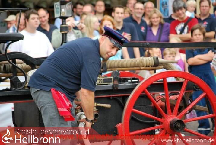 Bilder 7 + 8: historischer Löschangriff mit der voll funktionsfähigen Saugspritze Baujahr 1892