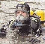 Bild 1: Wenn Feuerwehr und Rettungsdienst zusammenarbeiten, müssen sie die Probleme und Nöte des anderen kennen, um gutes Teamwork leisten zu können.Bild 2: Ein Auto wurde in den See geschleudert: Die Taucher sind gefragt.(Fotos: Andreas Veigel, HSt)