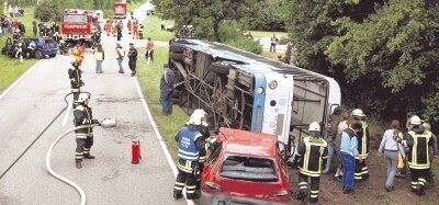 Testlauf Dieses Konzept für den Massenanfall von Verletzten (MANV), an dem ein Arbeitskreis vor Ort zwei Jahre lang arbeitete, wurde jetzt im großen Stil getestet. Das Übungsszenario dafür: Schulbusunglück mit 50 Verletzten. Der Bus liegt auf der Seite, in Sichtweite zwei weitere kaputte Autos. Ein drittes liegt mit Personen im See, das weiß nur noch keiner. Ein Fall für die Berufsfeuerwehr. Eineinhalb Stunden lang läuft für die Beobachter ein bunter, aufgeregter Film ab, der zunehmend von Notärzten und Rettungskräften bevölkert wird und sich links, rechts und weiter hinten abspielt. Zunächst nur Chaos, in das langsam und immer mehr Ordnung kommt. So soll es sein.
