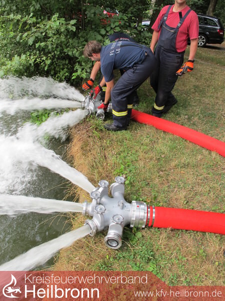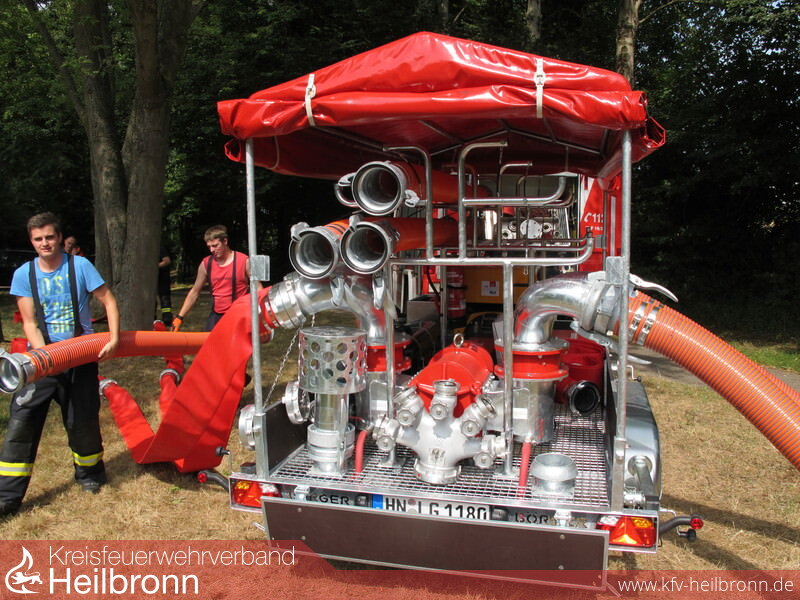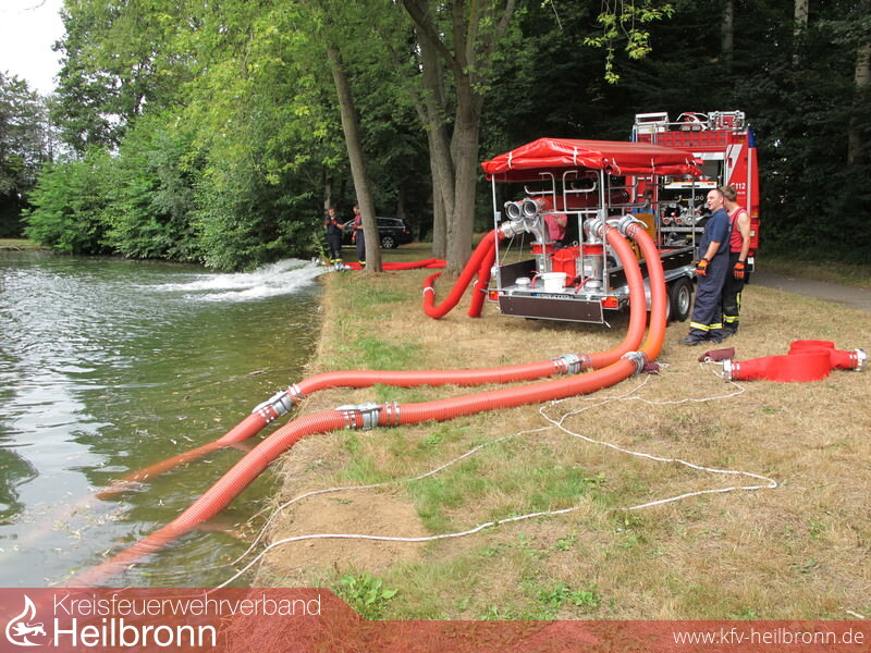 Stationiert wird dieses Gerät bei der Freiwilligen Feuerwehr Leingarten. Diese bringt die Pumpe an die Einsatzstellen und betreibt sie dort. Vergangenen Freitag fand dazu eine Einweisung der Ausbilder und Gerätewarte durch die Herstellerfirma statt. Auf einem Anhänger montiert, wird die Pumpe von einem 40 kW-Dieselmotor angetrieben und kann völlig unabhängig eingesetzt werden. Die nach dem Verdränger-Prinzip arbeitende Drehkolbenpumpe ist in der Lage 330.000 Liter pro Stunde zu fördern. Nicht nur Wasser, sondern auch Schlamm kann problemlos aus einer Tiefe von bis zu acht Metern gesaugt werden. Festkörper von bis zu 75 mm Durchmesser werden schadlos durchgepumpt. Zur Förderung der Wassermenge stehen Saug- und Druckseitig jeweils zwei Anschlüsse á 150 mm Durchmesser zur Verfügung. Verlastet sind auf dem Hänger zudem acht Saugschläuche (je 3m), acht F-Schläuche (je 5m) und zwei Verteiler von Größe F auf fünf Mal Größe B, um mit feuerwehrüblichen Schläuchen die druckseitige Strecke verlängern zu können. Im September werden die Maschinisten der Feuerwehr Leingarten auf die Pumpe geschult. Ab dann ist der Pumpenhänger für den Hochwasserzweckverband als auch für überörtliche Einsätze verfügbar.