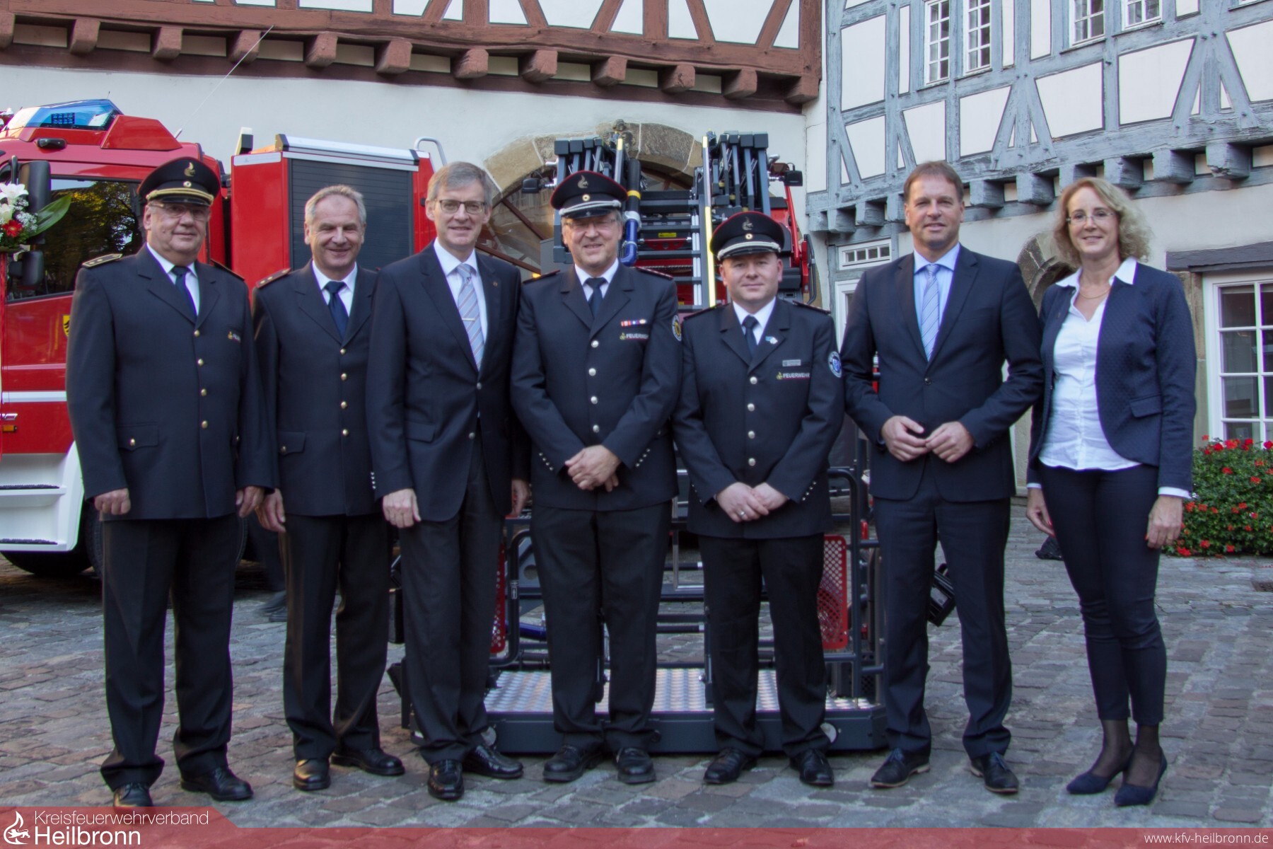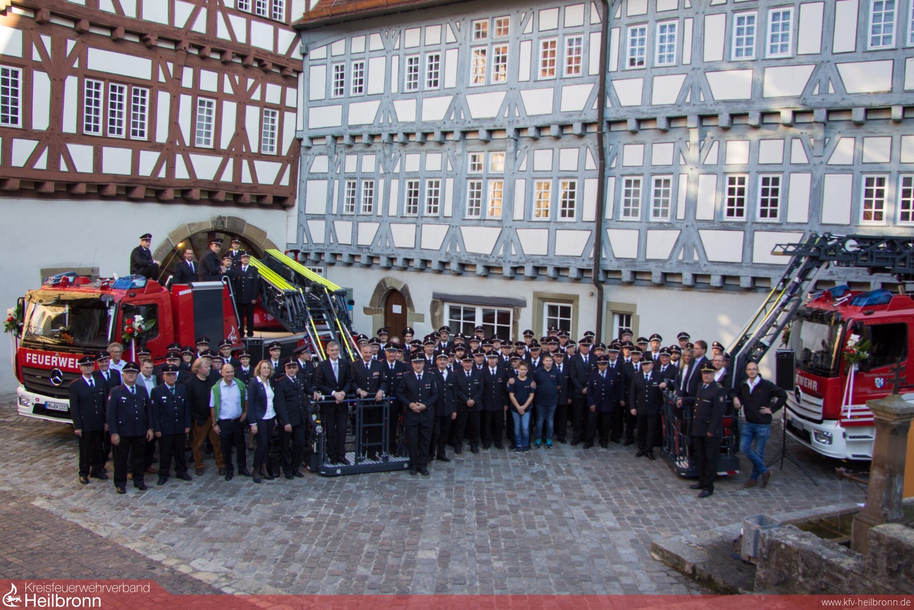 25 Wochen hatte es gedauert, bis es am 14.10. endlich soweit war - die Freiwilligen Feuerwehren Bad Friedrichshall und Bad Wimpfen konnten ihre neuen Drehleitern in Empfang nehmen. Hierfür trafen sich viele Gäste und Feuerwehrmänner und –frauen im Hof des alten Spitals in Bad Wimpfen.
