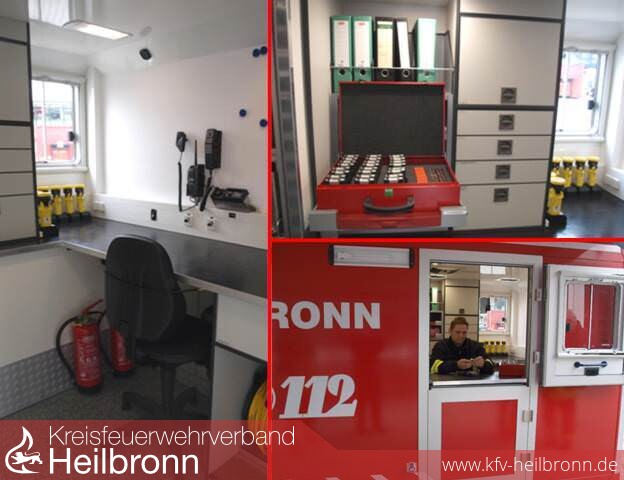 Durch eine Schiebetür kann der Arbeitsplatz im Fond des Containers von dem Geräteraum abgetrennt werden. Hier erfolgt die Dokumentation und Ausgabe der Einsatzmittel. Zur Erleichterung der Ausgabe kann die zweigeteilte Ausgangstür an der rechten Längsseite des Containers mit einer Theke versehen werden.