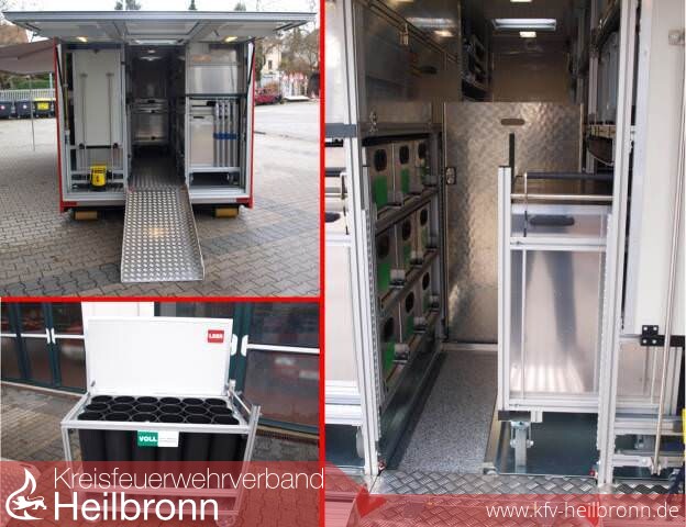 Die Firma GSF erhielt den Auftrag zum Bau des 6,90m langen, 2,50m breiten und 2,70m hohen Abrollbehälters. Der AB-AS wurde so konzeptioniert, dass er nicht nur dem reinen Materialtransport dient, sondern eine der wichtigsten Logistikkomponente für umfangreiche Atemschutzeinsätze darstellt.