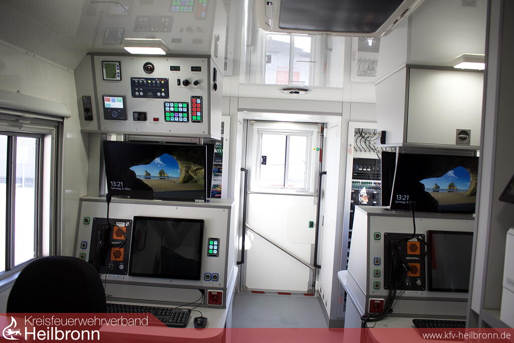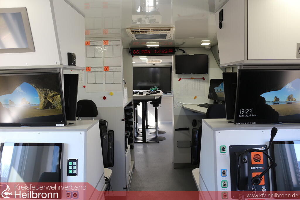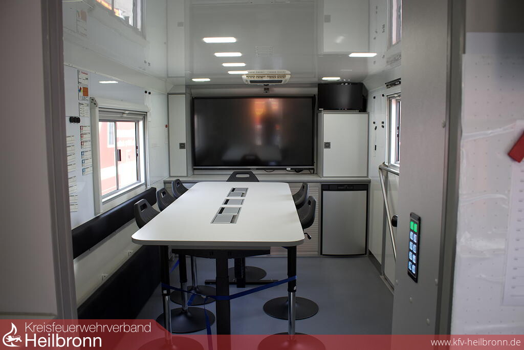 Mit der verbauten Technik kann die Einsatzleitung optimal unterstützt werden. Es gibt Möglichkeiten, Lagekarten darzustellen, um die Kräfte optimal aufzustellen, zudem können über einen Außenbildschirm Lageeinweisungen im Außenbereich durchgeführt werden. Das ist nicht nur hilfreich, um mehr Führungskräfte gleichzeitig zu erreichen, auch in der aktuellen Situation kann hier noch der Abstand zwischen den teilnehmenden Personen eingehalten werden.