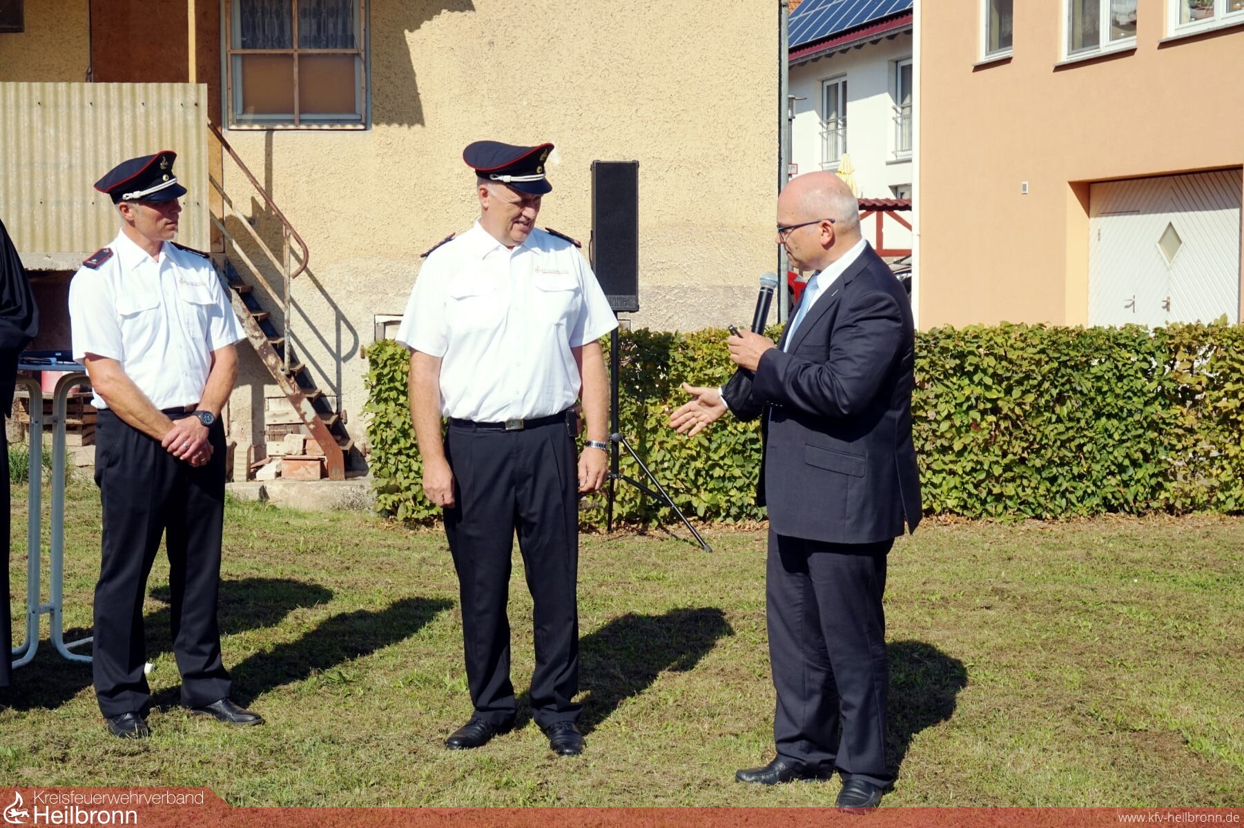 Abschließend übergab Bürgermeister Norbert Heuser den Schlüssel an Kommandanten Hartmut Schaffroth, dieser reichte ihn an die beiden zukünftigen Nutzer, Jürgen Heiß und Simon Kumm (Jugendfeuerwehrwart) weiter.