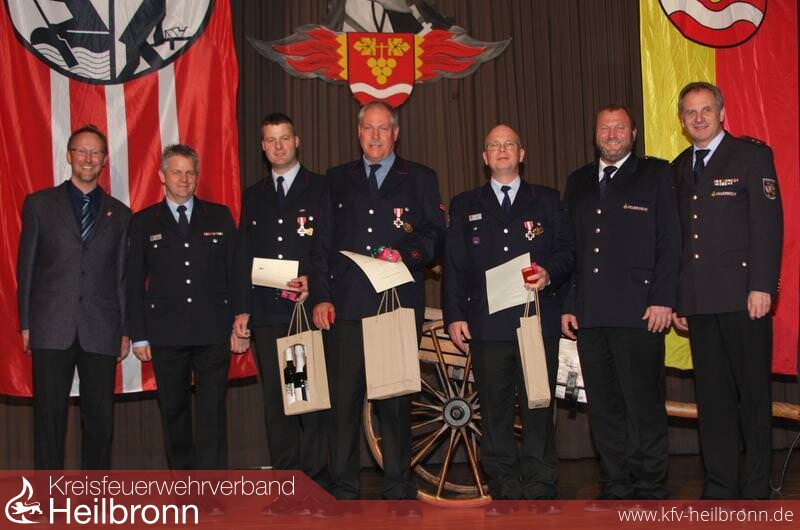 Mit dem Vorsitzenden des Kreisfeuerwehrverbandes, Reinhold Gall, ehrten Schiefer und Schmidt für 25 Jahre Dienst mit dem Feuerwehrehrenzeichen in Silber folgende Mitglieder: Reiner Schüro (Eschenau), Jochen Arnold (Eichelberg), Rüdiger Uebel (Obersulm) und Jürgen Schweikert (Weiler).