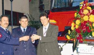 Bild: Bürgermeister Manfred Hebeiß übergibt den Fahrzeugschlüssel an die Kommandanten Jörg Wagner (Mitte) und Franz Menstell (links). Foto: Manfred Dod