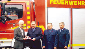 Bild: OB Volker Blust (von links) übergibt den Rüstwagen an Hermann Jochim und die Stellvertreter Wolfgang Rauh und Alfred Jochim. (Foto: privat)