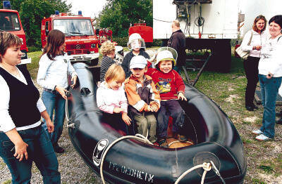 Bild: Den jüngsten Besuchern gefiel das Schlauchboot der Freiwilligen Feuerwehr beim Tag der offenen Tür besonders gut. (Foto: Rudolf Landauer)