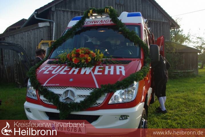 Am Abend stand dann die Segnung des neuen KLF-A auf dem Programm. Nach der Schlüsselübergabe von Bürgermeister Zieher an Feuerwehrkommandant Franz Weiser wurde das Fahrzeug von Dechant Pfarrer Alois Maier feierlich gesegnet. Das von der Firma Rosenbauer gebaut Fahrzeug kostete 132.000 €. Diese Kosten wurden vom Bundesland Oberösterreich, dem Feuerwehrbezirk Vöklabruck, der Gemeinde Pöndorf, der Feuerwehr Schwaigern und zahlreichen Spendern aufgebracht. Das KLFA-A Heckbeladung ist auf einem 5,5 Tonnen Sprinter Allrad Fahrgestell aufgebaut und hat einen 184 PS Motor, Besatzung 1 + 8. Als Pumpe steht eine TS8 zur Verfügung. Ein 14 KVA Stromgenerator versorgt u.a. den Lichtmast und die Umfeldbeleuchtung. Darüber hinaus wird die feuerwehrtechnische Beladung für eine Löschgruppe mitgeführt.