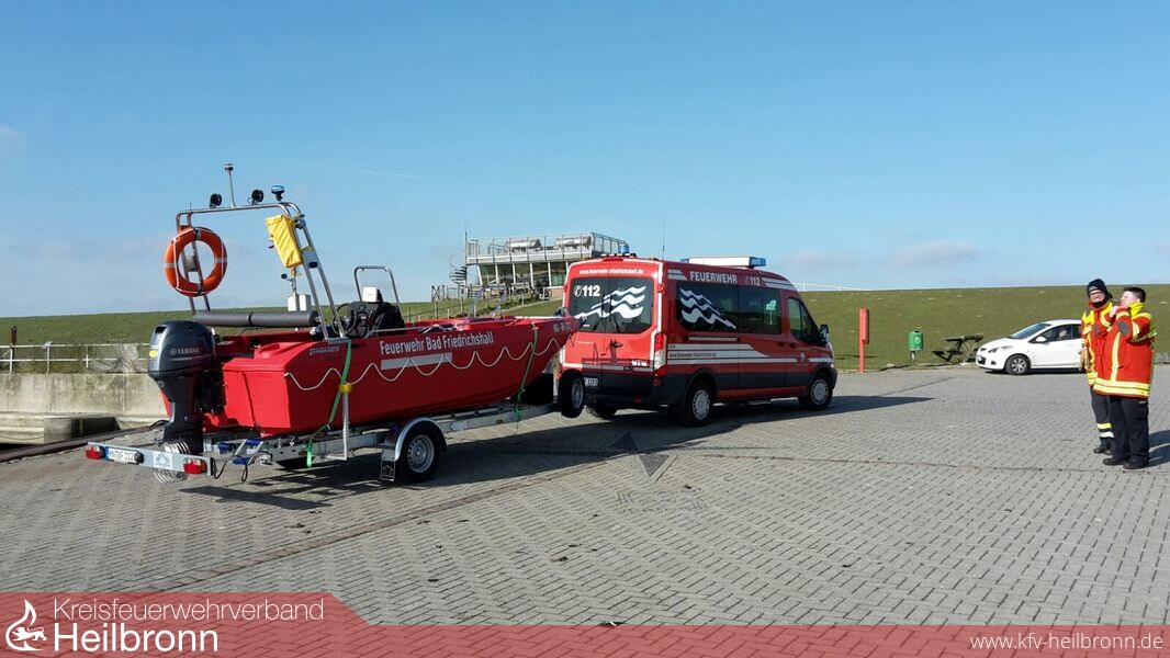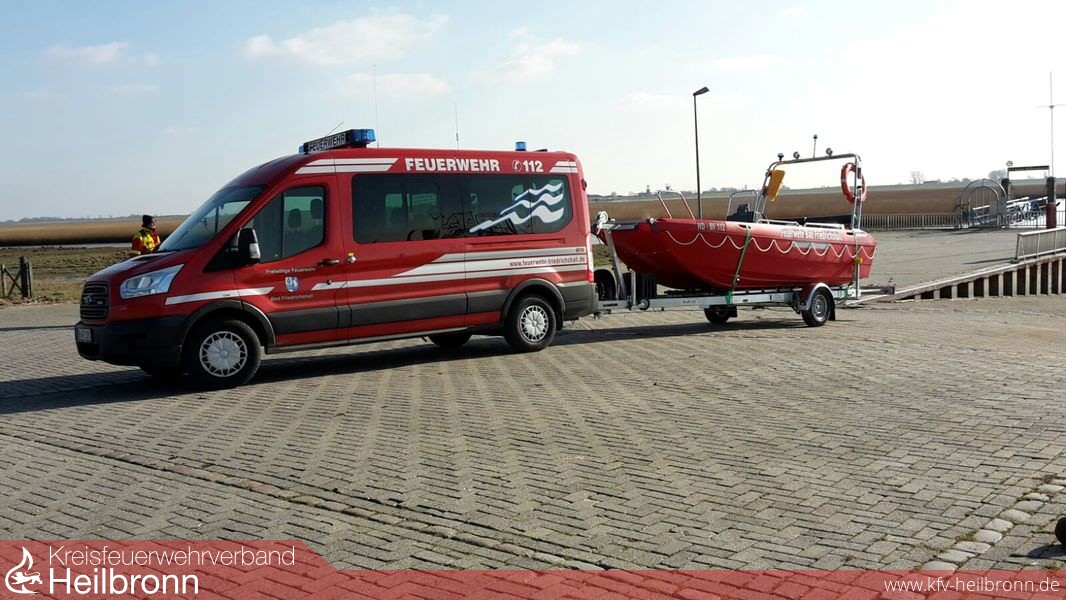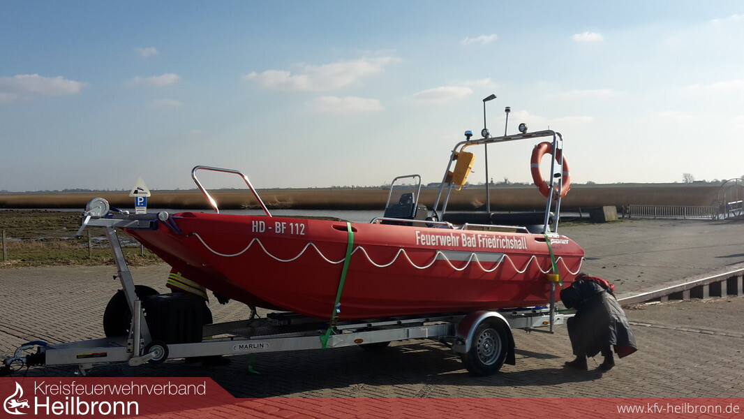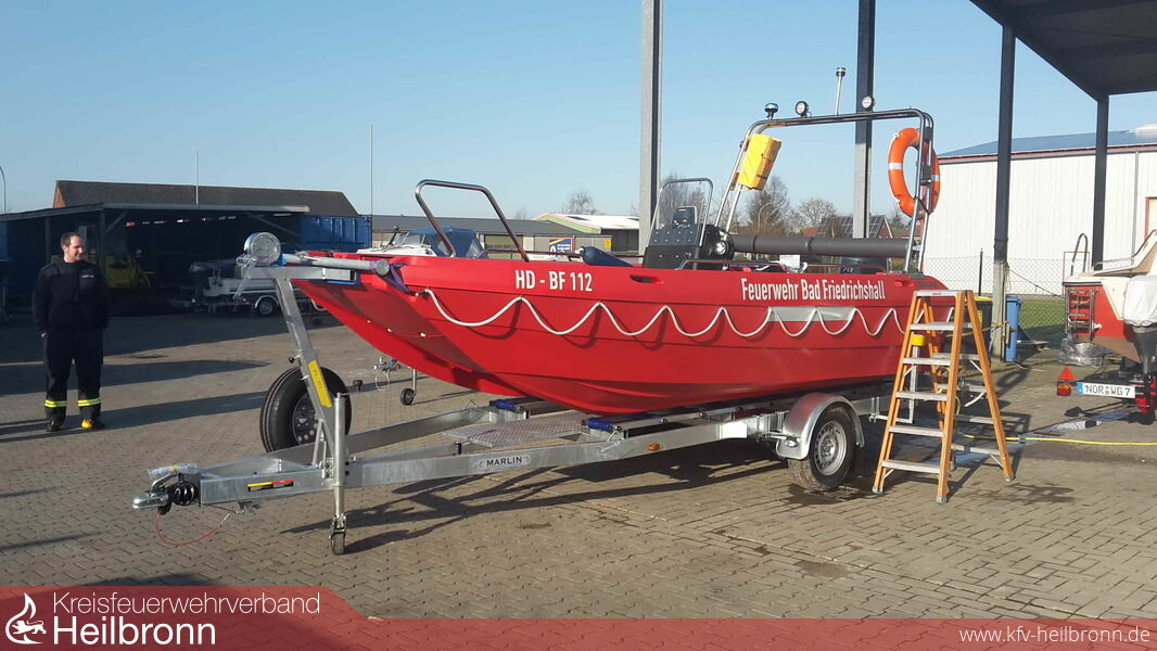 Nach rund einem halben Jahr Planung der Arbeitsgruppe konnte das neue Rettungsboot (RTB) von einer Abordnung der Feuerwehr in Ihlow (Ostfriesland) bei der Firma Matschke & Müller GmbH Co.KG abgeholt werden. Bei dem RTB handelt sich es um ein Motorboot „Pioner Mulit III“ aus einem robusten und schwimmfähigen PPE-Kunststoff hergestellt. Die Gewichtsbilanz des Wasserfahrzeugs konnte dadurch reduziert werden. Das Boot hat inklusive Motor und Ausstattung ein Eigengewicht von 1.000 kg. Der Rumpf ist aus einem Stück gegossen. Auch der geringe Tiefgang von nur 30 cm ist dem Material geschuldet. Im Gegensatz zu den meisten anderen Einsatzbooten verfügt das Multi über gute Handhabungs- und Fahreigenschaften und erreicht dadurch eine hohe Zuladungskapazität von rund 1.200 kg. Dank seiner weichen Bugform und dem längslaufenden Doppelkiel bietet das Pioner Multi eine hohe Spurstabilität auf dem Wasser und kann so auch mit den meisten Sportbooten konkurrieren. Eine Besonderheit gibt es auch beim Rumpf des Bootes. Dieser besteht vorne aus einem Katamaran und hinten aus einem selbstlenzenden Trimaranrumpf. Motorisiert ist das Rettungsboot mit einem Yamaha 70 PS Motor. Das Boot ist mit einem Steuerstand ausgestattet, dort befindet sich auch das 4 Meter Funkgerät. Am klappbaren Trägerbügel sind Beleuchtung, das Nebelhorn, ein Blaulicht sowie Arbeits- und Suchscheinwerfer angebracht. Bei dem 5,3 m langen und 2,15 m breiten Boot ist die Bugklappe durch eine mechanische Edelstahlkurbelwinde stufenlos einstellbar. Die Klappe ist selbstschwimmend und hat eine Auftriebskraft von 75 kg. Hierdurch können insbesondere zu rettende Personen effektiv auf das Boot gezogen werden. Das Rettungsboot ist auf einem Trailer mit 100 km/h Zulassung verlastet. Die Beleuchtung ist komplett wasserdicht und muss beim Slippen nicht zuvor abgenommen werden. Speziell um Schäden durch Flachwässer im Bereich der Flüsse Kocher und Jagst frühzeitig zu erkennen und zu vermeiden, aber auch eventuell zur Ortung von ertrunkenen Personen oder anderen Dingen im Wasser wurde ein Echolot mit Tiefenmessung im Boot verbaut. Mit dem Hubgeschirr besteht die Möglichkeit das Rettungsboot im Extremfall auch außerhalb der Slipanlagen ins Wasser zu bekommen.