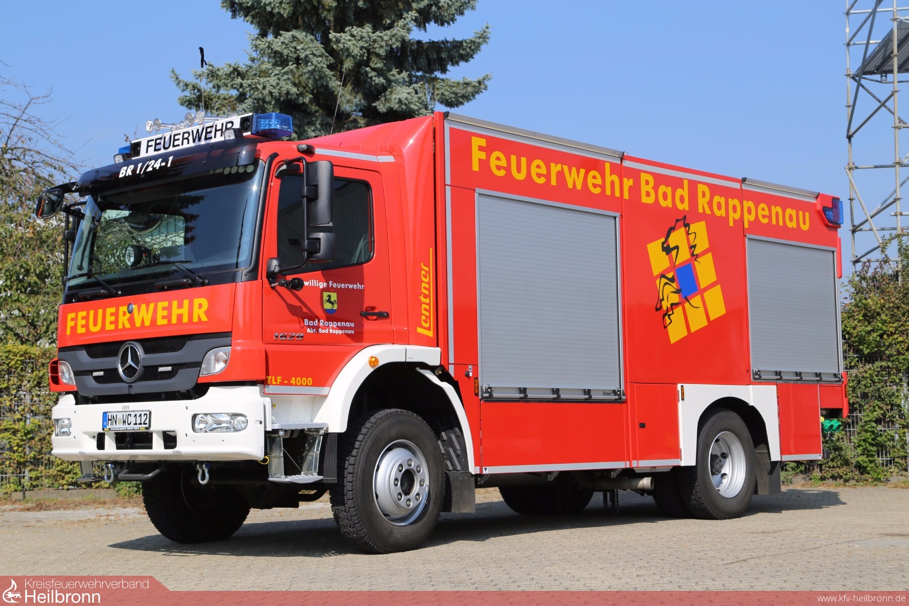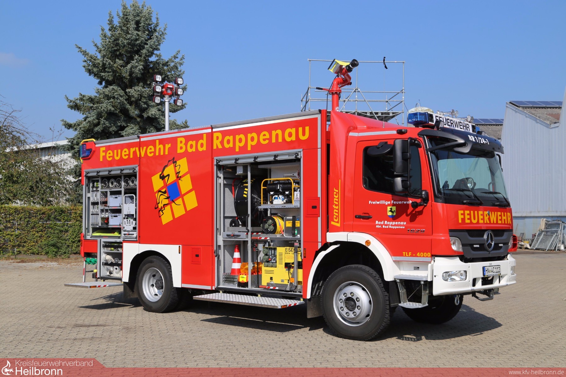 Seit September 2017 verfügt die Feuerwehr Bad Rappenau über ein Tanklöschfahrzeug - TLF 4000. Das nach Norm ausgeschriebene und gefertigte Fahrzeug verfügt über einen Löschwassertank mit 5000l Inhalt sowie einen Schaummitteltank mit 500l Inhalt. Mögliche Einsatzszenarien sind u.a. Fahrzeugbrände, Vegetationsbrände, Brände auf landwirtschaftlichen Anwesen sowie Brände im Industrie- und Gewerbebereich. Bei Unwettereinsätzen kann das Fahrzeug als autarke Einheit eingesetzt werden. Der modulare Aufbau der Fa. Lentner wurde auf einem Mercedes-Benz 1629 AF Fahrgestell aufgebaut. Das Fahrzeug verfügt über einen permanenten Allradantrieb. Sofern das Fahrzeug zur Überlandhilfe angefordert wird, kann es durch die Leitstelle über einen separaten RIC alarmiert werden. Das Fahrzeug rückt dann ohne weitere Begleitfahrzeuge aus.