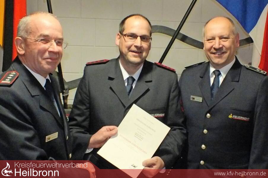 Bild: Jürgen Herkle (Mitte) wurde für 25 Dienstjahre von Kommandant Bernd Kircher (links) und dem Vize-Kreisbrandmeister Uwe Thoma geehrt. (Foto: Wolfgang Seybold)