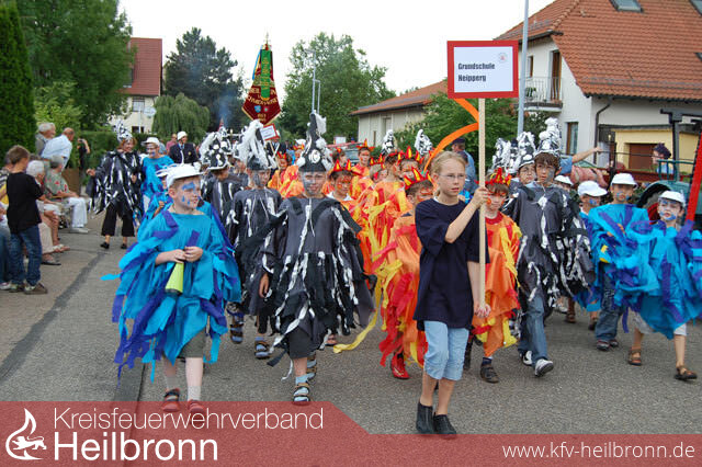 Landfrauen Auch die Landfrauen aus Dürrenzimmern und Brackenheim haben zu Ehren der Feuerwehrleute viel Mühe in Kostüme von historischen Waschweibern und Damen aus dem 18. Jahrhundert gesteckt. Seit Wochen basteln bereits die Grundschüler der verschiedenen Stadtteile an Schildern und Kostümen: „Hurra, hurra, die Schule brennt... vor Begeisterung!“ heißt es etwa aus Botenheim, ähnlich haben die Stockheimer Schüler das Thema aufgegriffen. Über zweieinhalb Stunden zieht der einmalige Tross vorbei an unzähligen begeisterten Zuschauern und begleitet von der Musik der Spielmannszüge durchqueren die bunten Gruppen die Brackenheimer Innenstadt. Mit einem eindrucksvollen Fahneneinmarsch geht es ins Festzelt.