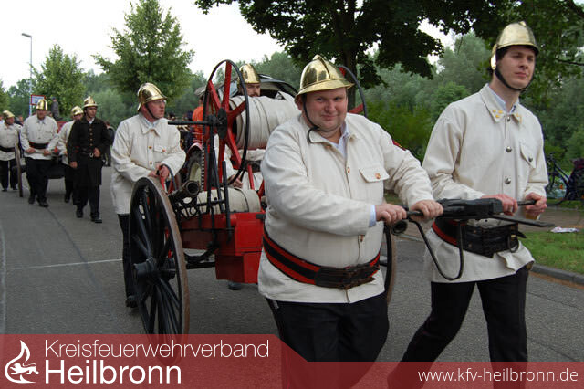 Während die Gastgeber mit dem modernen Tanklöschfahrzeug (TLF) und der 30 Meter hohen Drehleiter mit Korb (DLK) das Heute repräsentieren, haben die vielen Gäste aus dem gesamten Landkreis vor allem Historisches dabei: Pumpen und Schlepper aus den Jahren 1861 und 1889 hat die Freiwillige Feuerwehr aus Obersulm dabei, eine Handpumpe von 1863 zeigen die Leingartener Feuerwehrleute. Dass die Feuerwehrspritze von 1862 noch völlig intakt ist, demonstrieren die Kameraden aus Lauffen der großen Zuschauermenge. Mit einem Tragkraft-Spritzenfahrzeug sind die Nachbarn aus Cleebronn angereist: „Wir haben ein enges Verhältnis zueinander“, sagt Kommandant Jörg Schellenbauer. Schon oft habe man sich gegenseitig ausgeholfen und Ausbildungen gemeinsam wahrgenommen. „Natürlich haben wir an diesem Wochenende auch schon miteinander gefeiert. Das ist selbstverständlich.“