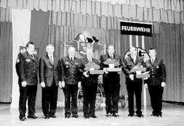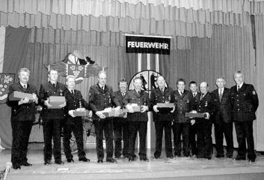 Eberhard Stein, Klaus Hoffmann, Harald Frech, Ewald Hube, Walter Schweizer, Rolf Kugler, Herbert Kuhn und Uwe Biber sind 25 Jahre Mitglied der Wehr. Auf 40 Dienstjahre bringen es Helmut Biehler, Karl Riedel und Heinrich Stutz. Dafür erhielten die Feuerwehrkameraden eine Auszeichnung.