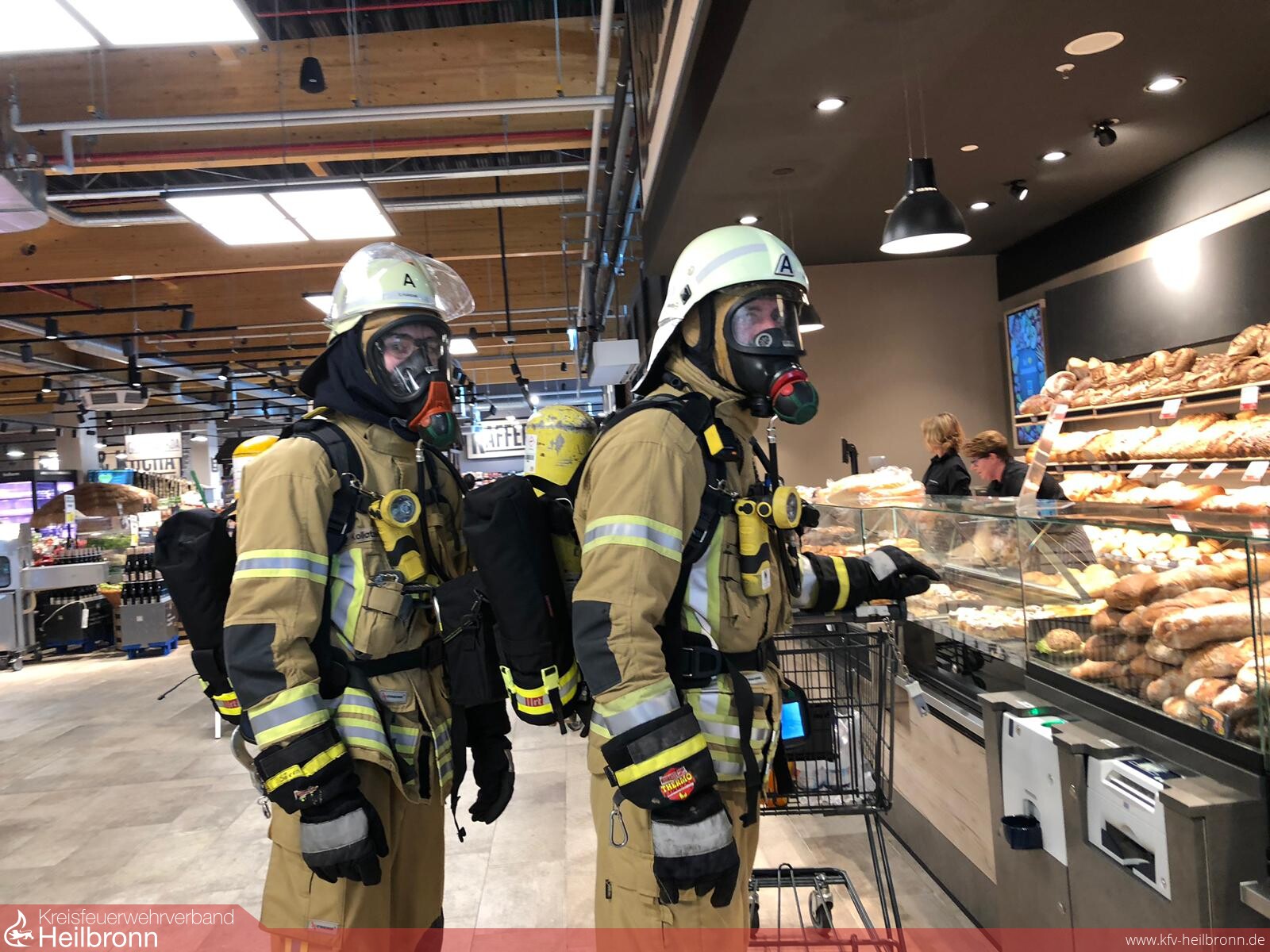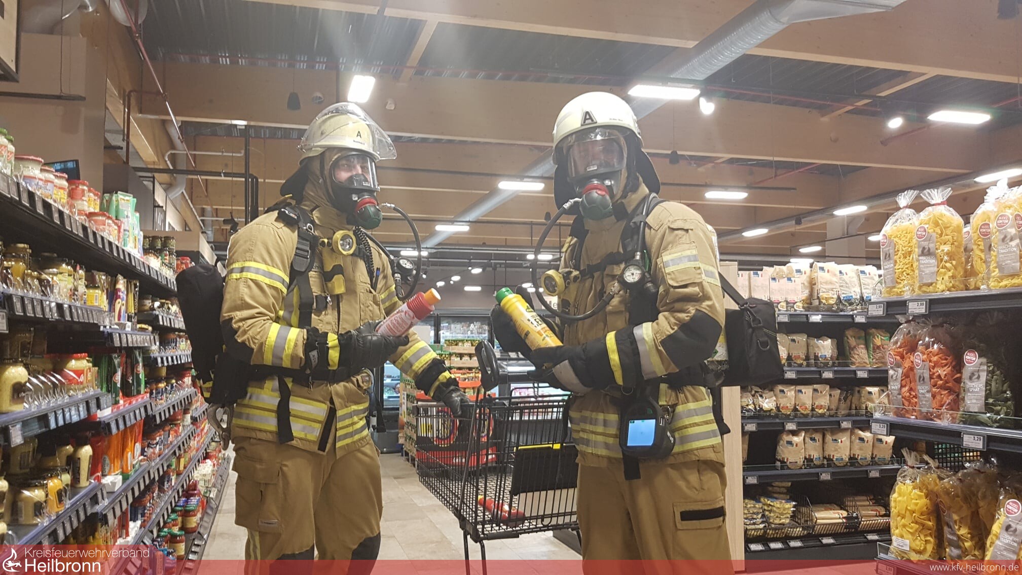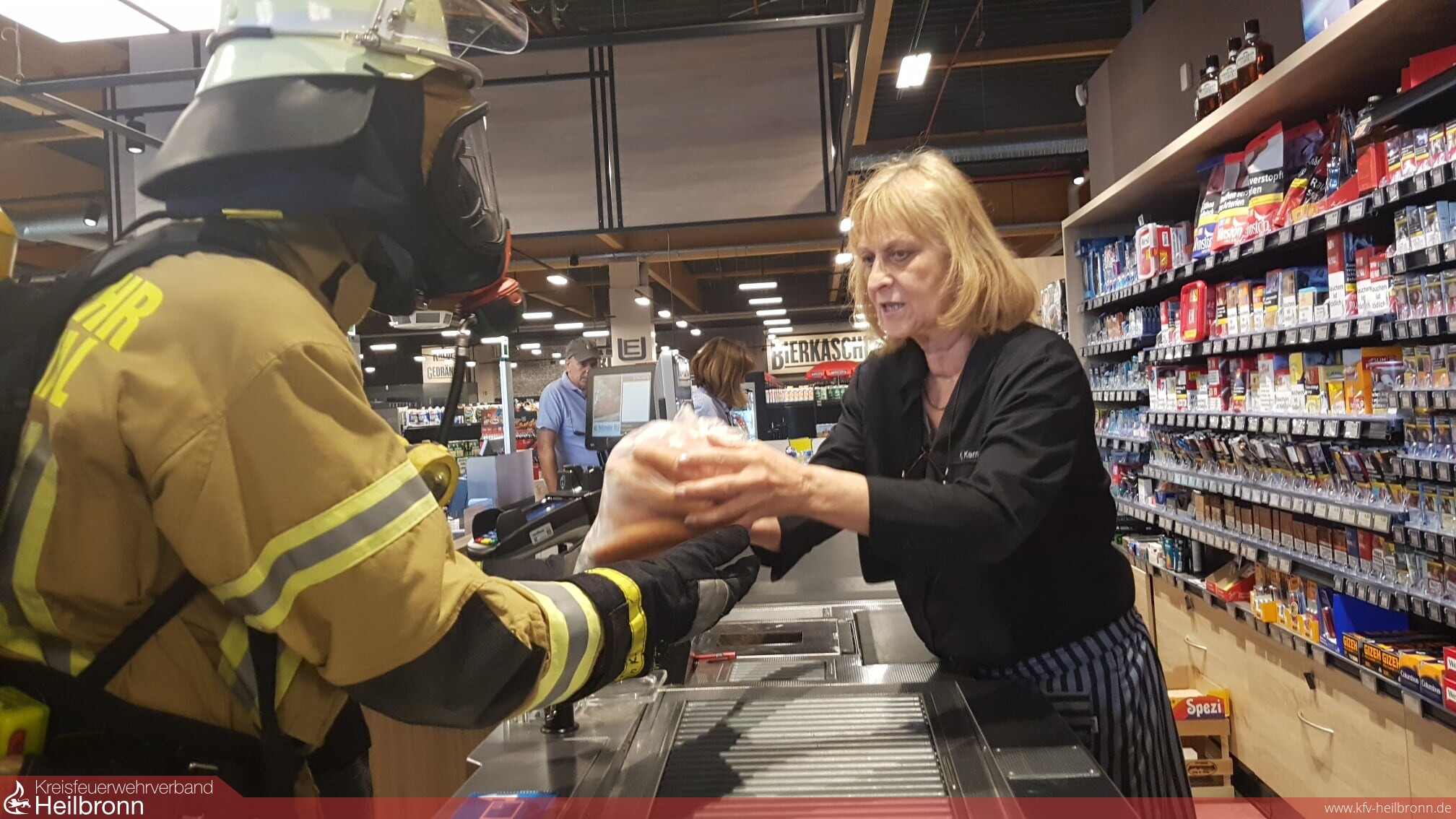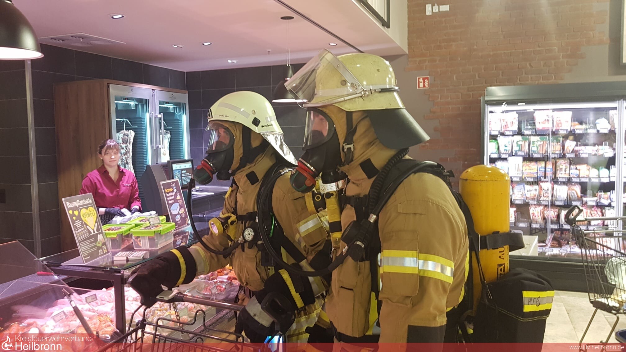 Große Augen und erstaunte Blicke gab es am Samstag im neuen Edeka Markt in Ellhofen. Bürger gehen Einkaufen und es kommt ein Trupp der Feuerwehr unter Atemschutz mit einem Einkaufswagen durch die Gänge, steht an der der Metzgertheke an, holt frische Brötchen beim Bäcker. Es brennt nicht im Markt, auch gibt es keinen Einsatz.