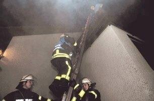 Rauch quilt aus der Eingangstür. Das Szenario: Im Keller ist ein Wäschetrockner in Brand geraten. Drei Bewohner stehen auf der Terrasse und warten auf Hilfe. Ein Trupp marschiert mit den Wasserschläuchen ins Gebäude. Der andere kommt mit einer Leiter.