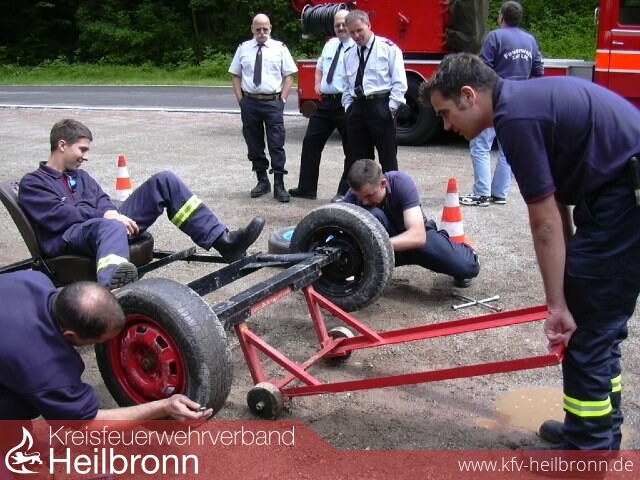 Um 1100 war Aufstellung zur Rallye in der Stadtmitte. Diese führte in einem ca. 40 km langen Rundkurs um Lörrach und die Nachbargemeinden. Auch ein kurzer Ausflug in die Schweiz war inbegriffen. Insgesamt waren im Verlaufe der Rallye 5 Stationen mit verschieden Wertungsprüfungen zu bestehen. Geschicklichkeitsprüfungen wie Wasserförderung mittels Schwämmen, ?Lattengolf? (ein Ball läuft über zwei Latten und muss über einem Rohr abgelegt werden.), Hufeisenwerfen, Pit Stop (Reifenwechsel Vorderachse PKW) und last but not least Wasserförderung über ein Hydrophor (1min zu zweit) waren im Verlaufe dieser Rallye zu bewältigen.