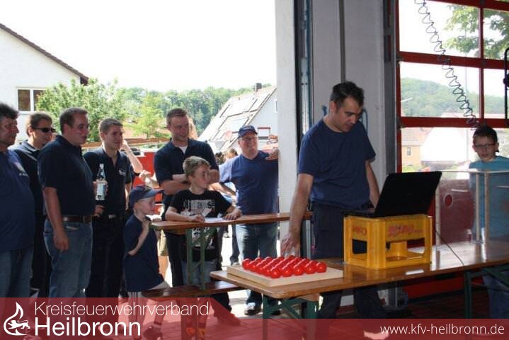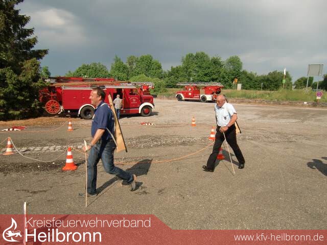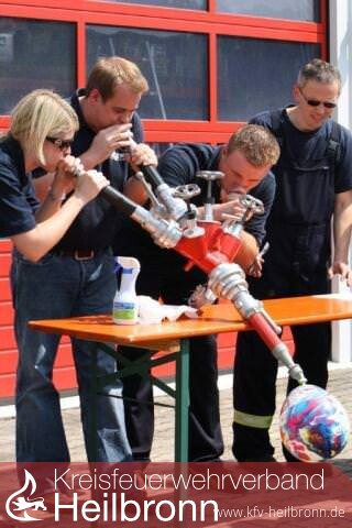 Weiter gehts entlang der Jagst bis nach Möckmühl. Am Treffpunkt Gerätehaus werden wir von den Kameraden der dortigen Feuerwehr bereits erwartet und herzlichst empfangen. Sie haben schon alles vorbereitet um uns zum Schwitzen zu bringen. Kegeln mit Feuerwehrschläuchen, Füllen von Schläuchen mit Gummistiefel und Aufblasen von Luftballons über Strahlrohr und Verteiler waren die hiesigen Disziplinen. Aber auch ein nettes Gespräch und ein kühles Getränk hatten sie für uns. Hierfür nochmals vielen Dank den Feuerwehrkameraden aus Möckmühl.