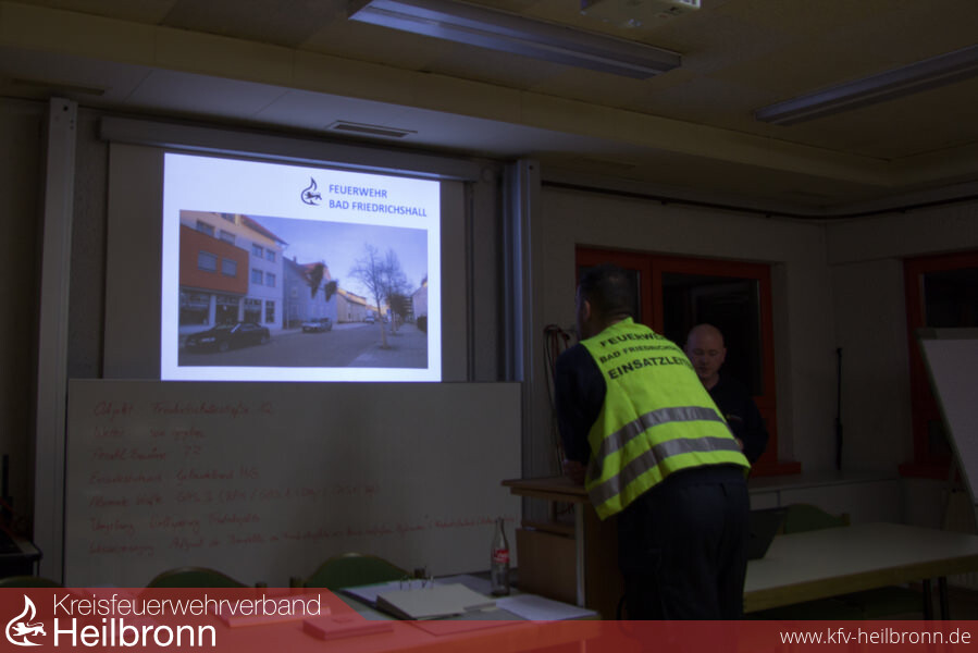 Für diesen Abend wurde durch Kommandant Marcel Vogt und sein Stellvertreter Volker Windbiel ein „Planspiel“ für die Führungskräfte und die Mitglieder der Führungsgruppe vorbereitet. Hierbei wurde, wie in einem Ernstfall, die Stadtverwaltung mit der Sachbearbeiterin „Asyl“ mit einbezogen. Das Einsatzstichwort lautete „Gebäudebrand mit Menschenleben in Gefahr in einer Flüchtlingsunterkunft“ in der Friedrichshallerstraße 12.