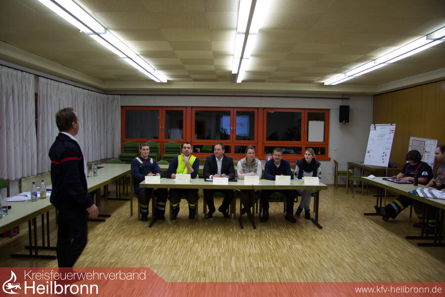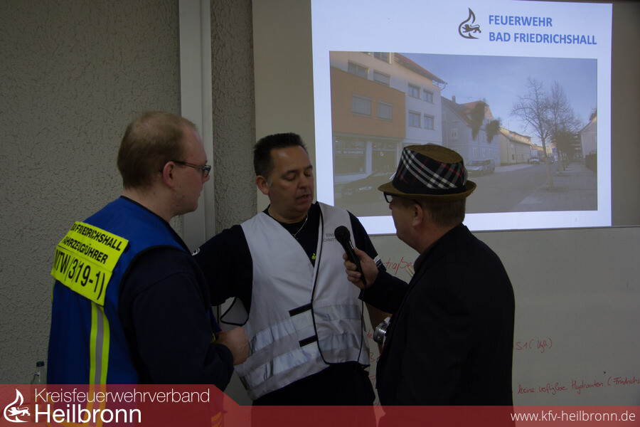 Drei Feuerwehrkameraden, teilweise verkleidet als „echte“ Pressejournalisten „löcherten“, mit teilweise überspitzen Fragen das Gremium. Klaus Mangold Pressesprecher und Sachgebietsleiter S 1 der Feuerwehr Bad Friedrichshall moderierte die Konferenz. Gespannt hörten die Zuhörer den Statements der einzelnen Redner zu. Vorsitz der Pressekonferenz hatte Bürgermeister Timo Frey, welcher in seinem einleiteten Vortrag fachlich begeisterte. Stellenweise war das Gefühl der Übungskünstlichkeit in weite Ferne gerückt. Wir wollen uns an dieser Stelle bei alle Beteiligten für die ernste und professionelle Mitarbeit recht herzlichen bedanken. Abschließend kann man durchaus sagen, dass so ein Szenario sicherlich die Grenzen aller Beteiligten erreichen wird, aber alle Stellen ihre Aufgabe sehr ernst nehmen und sehr gut auf solche Szenarien vorbereitet sind.