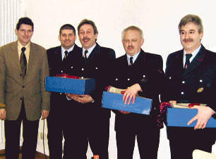 Bild: Bürgermeister Manfred Hebeiß und Kommandant Jörg Wagner ehrten verdiente Feuerwehrmänner für 25 Jahre Treue zur Wehr.