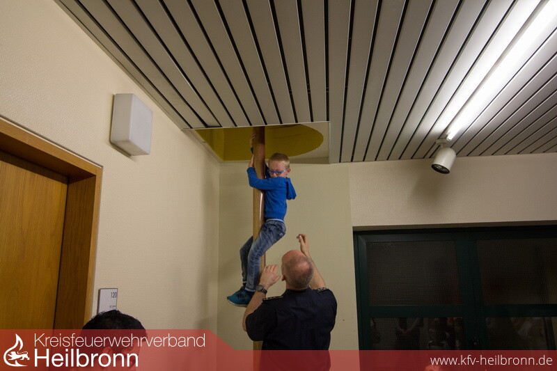 Um den Weg eines Notrufs nun weiterzugehen, ging es über eine Rutschstange eine Etage tiefer. Die Schlauchwerkstatt und danach die Atemschutzwerkstatt aren das erste Ziel. Als nächstes folgte die große Fahrzeughalle mit den vielen verschiedenen Fahrzeugen besichtigt. Auch die, im Haus befindliche, Atemschutzstrecke wurde begutachtet. Für die Kinder war der „Käfig“ eher ein großer Spielplatz, den sie ausgiebig verwendet haben. Runde über Runde liefen und kletterten sie durch den verzweigten Weg und wollten gar nicht mehr aufhören. Das Beste zum Schluss: Die Kinder durften mit der Drehleiter in die Höhe fahren und einen Blick über Heilbronn werfen.