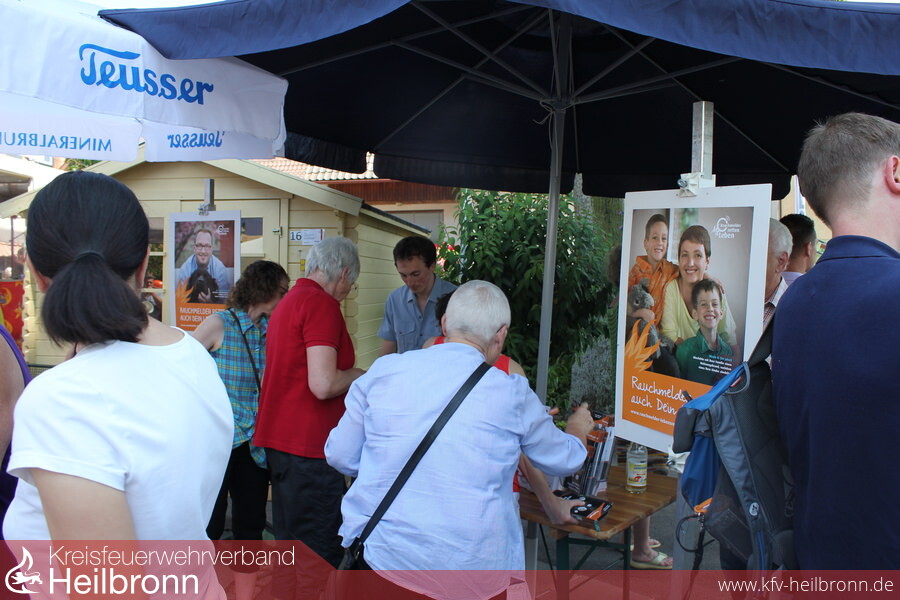 Gleich nebenan geben drei Kameraden aus der Einsatzabteilung den Besuchern Infos über Rauchwarnmelder. Von „die gehen doch immer fehlerhaft los“ über „super Sache, hat mir selbst schon das Leben gerettet“ ging man mit den Interessierten und Skeptikern ins Gespräch und demonstrierte beispielhaft an einem Qualitäts-Rauchwarnmelder mit 10-Jahres-Batterie, das öftere Batteriealarme oder sogar Fehlauslösungen mit einer gering höheren Investition im Gegensatz zu sehr günstig eingekauften Meldern der Vergangenheit angehören können. In den Gesprächen wurde auch deutlich, das die vergangene Woche beschlossene Rauchwarnmelderpflicht die Bürgerinnen und Bürger nun zum Informieren und Handeln auffordert. „Das wurde doch nun beschlossen, jetzt muss ich mich darüber Informieren“ wurde mehrmals vernommen.