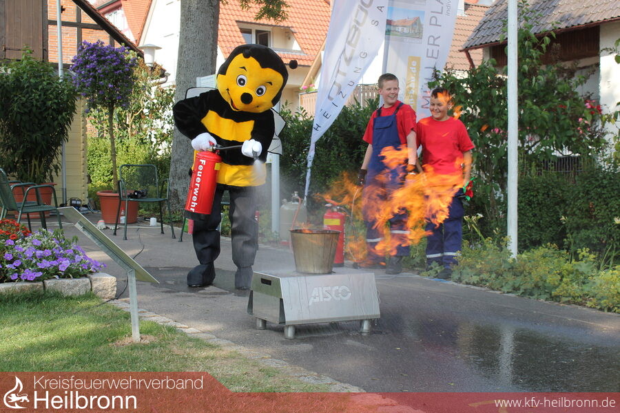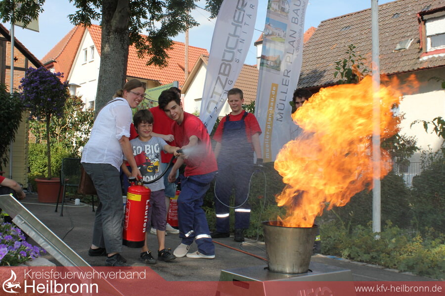 Nach der Schauübung ließ die Jugendfeuerwehr die Besucher noch an einem von der Freiwilligen Feuerwehr Lauffen ausgeliehenen Firetrainer mit Übungsfeuerlöschern selbst ein Feuer löschen. Gerade von Kindern wurde dies angenommen. Wer weiss ob einer der kleinen dank solcher Aktionen in der Öffentlichkeit mal bei der Jugendfeuerwehr landet?