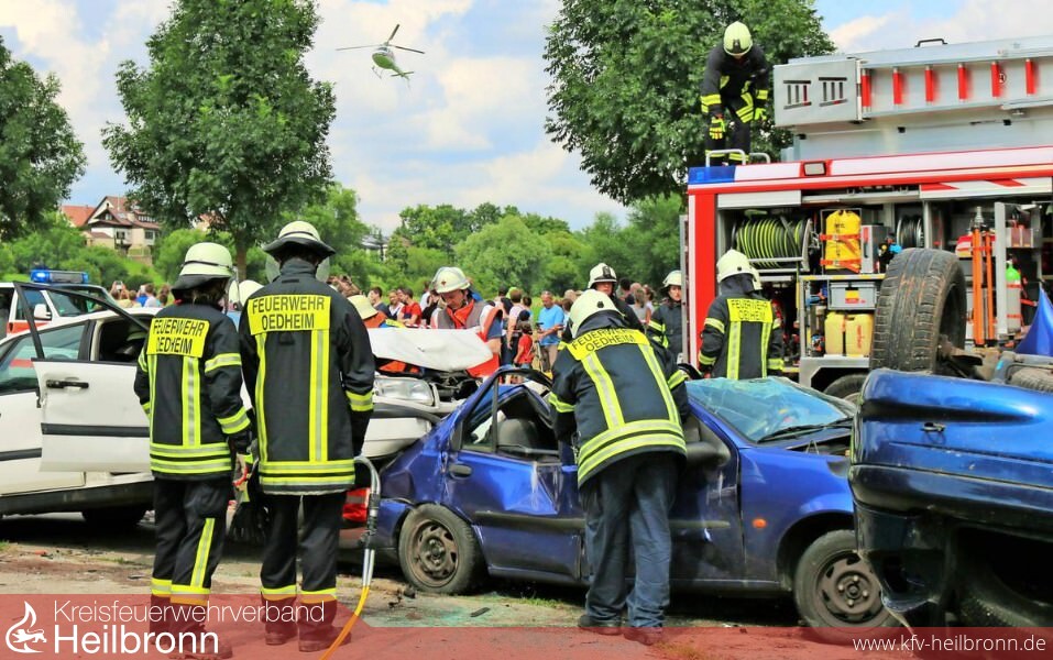 Fassanstich Moderiert von Kommandant Kübler, rückten mehrere Fahrzeuge an. 22 Feuerwehrleute eines von Marcel Glaser geleiteten Zugs zeigten mit Rettungsspreizer oder Löschschaum vollen Einsatz, ebenso die Mitglieder der DRK-Ortsgruppen aus Neuenstadt und Gundelsheim.