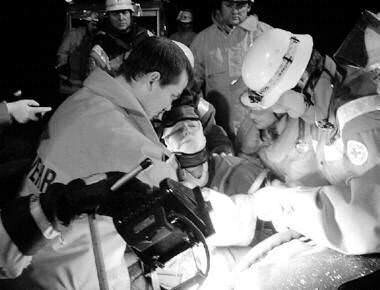 Jetzt galt es, in zwei Einsatzgruppen den Verletzten bei klirrender Kälte schnell zu helfen. Die Schnelleinsatzgruppe des Gundelsheimer Roten Kreuzes unterstützte schon in der frühen Phase des Einsatzes nach Kräften. Bei den eingeklemmten Verletzten konnten die Helfer Verletzungen an der Wirbelsäule nicht ausschließen, so dass zur schonenden Rettung Türen und das Dach des Fahrzeugs entfernt wurden. Hier war umsichtiges Hantieren mit schwerem Rettungsgerät gefordert.