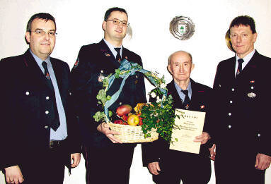 Beim gemütlichen Teil, im Vereinsheim der Massenbachhausener Kleintierzüchter, nahmen Kommandant Schwarz und der stellvertretende Bürgermeister und Feuerwehrmann Walter Müller eine besondere Ehrung vor. Seit 60 Jahren gehört Albert Baumgärtner der Freiwilligen Feuerwehr Massenbachhausen an. Dafür gab es eine Urkunde und einen Geschenkkorb.