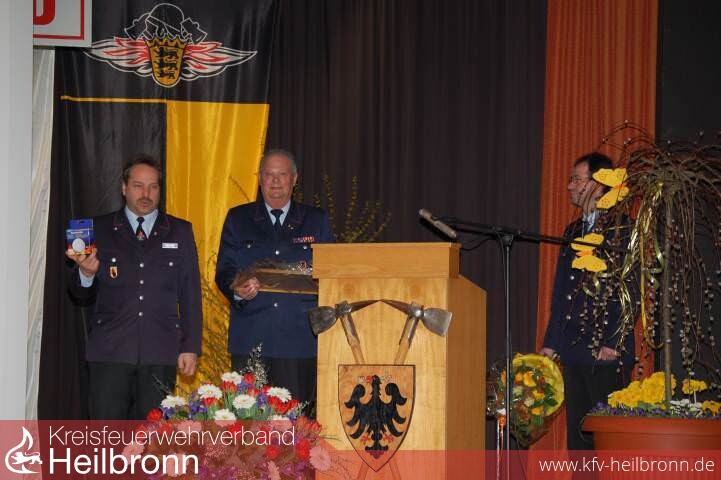 Reinhold Korb verabschiedetEinen Wermutstropfen gab es bei dieser Delegiertenversammlung aber auch: die Verabschiedung des langjährigen Verbandsvorsitzenden Reinhold Korb.„Reinhold hat uns die letzten zehn Jahre intensiv begleitet; ich war mehr dienstliche Zeit mit ihm zusammen, als zu Hause", so Knut Steinbauer über den scheidenden Vorsitzenden. „uns verbindet ein sehr vertrauensvolles, fast freundschaftliches Verhältnis. Es verging kaum eine Woche, in der wir nicht miteinander telefoniert haben". Entsprechend herzlich fiel dann auch die Verabschiedung aus, bei der Knut Steinbauer als „Vorgriff" auf das große, gemeinsame Abschiedsgeschenk von Kreisjugendfeuerwehr und Feuerwehrverband, ein Bild und - schließlich war Freitag der 13. - einen Rauchmelder überreichte.Entsprechend bescheinigte auch der neue Verbandsvorsitzende Reinhold Gall seinem Vorgänger eine tadellose Arbeit in Sachen Jugendfeuerwehr: „Dank der Arbeit von Reinhold kann ich einen völlig intakten Jugendfeuerwehr-Verband übernehmen."