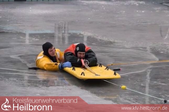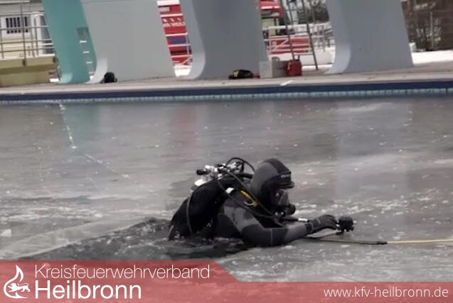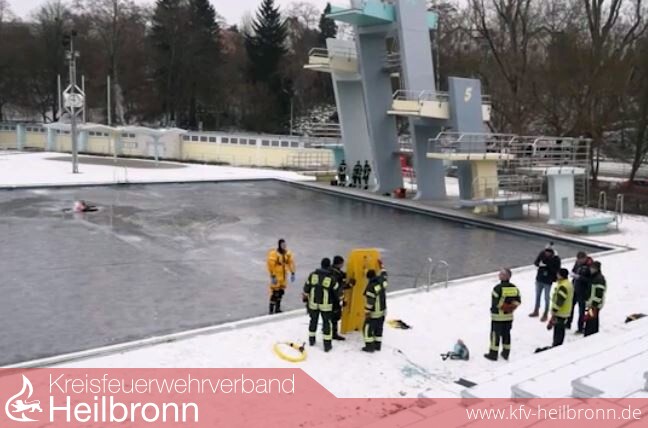 Aus dem Loch in der Eisfläche ragen Kopf und Arme, Hände in blauen Handschuhen winken, Hilferufe hallen durch das Freibad Neckarhalde. Wo im Sommer Groß und Klein schwimmen, planschen und vom Zehn-Meter-Turm springen, üben Heilbronner Feuerwehrmänner bei morgendlichen Frosttemperaturen, Menschen zu retten, die ins Eis eingebrochen sind.
