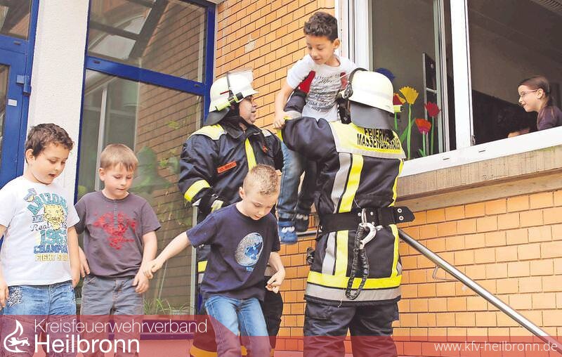 Bild: Hier wird der Ernstfall geprobt: Einen Erstklässler nach dem anderen hieven die Feuerwehrmänner durchs Fenster ins Freie. (Foto: Stefanie Pfäffle)